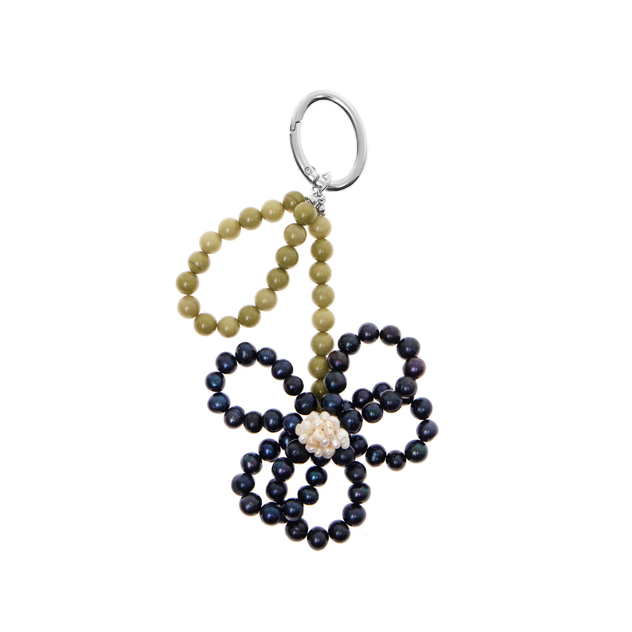 Подвеска-цветочек от бренда Pearly Cloud, в которой сочетаются несколько видов жемчуга и нефритовые камни - наше стильное "да" для вашей сумочки или брюк.