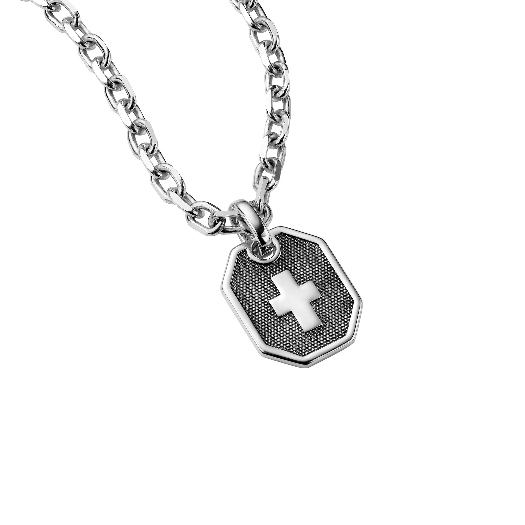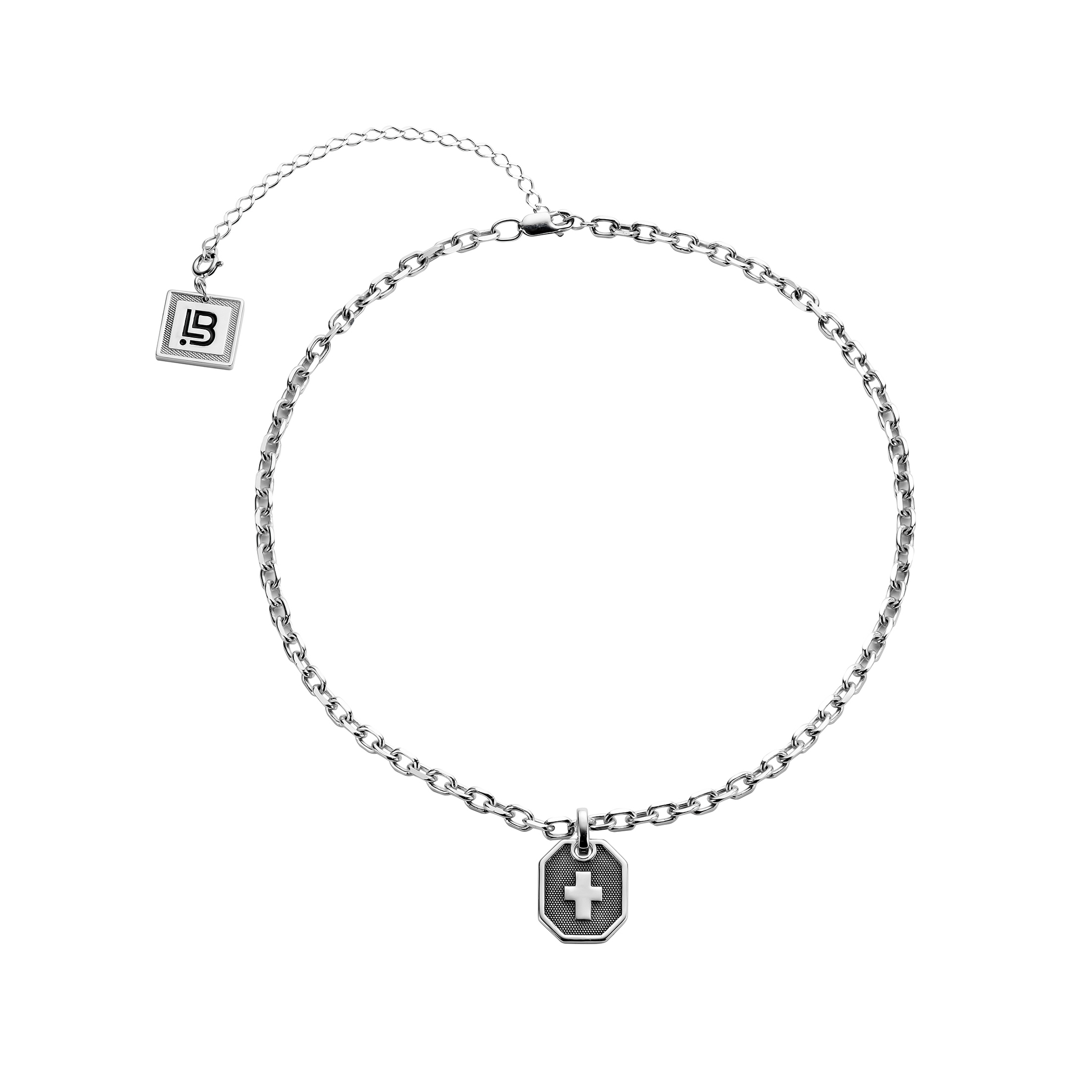Подвес в виде жетона с оригинальной фактурой. Сделан в технике точечного нанесения черного родия, чтобы затемнить поверхность — так крест выглядит эффектнее, а цепочка сияет еще ярче.