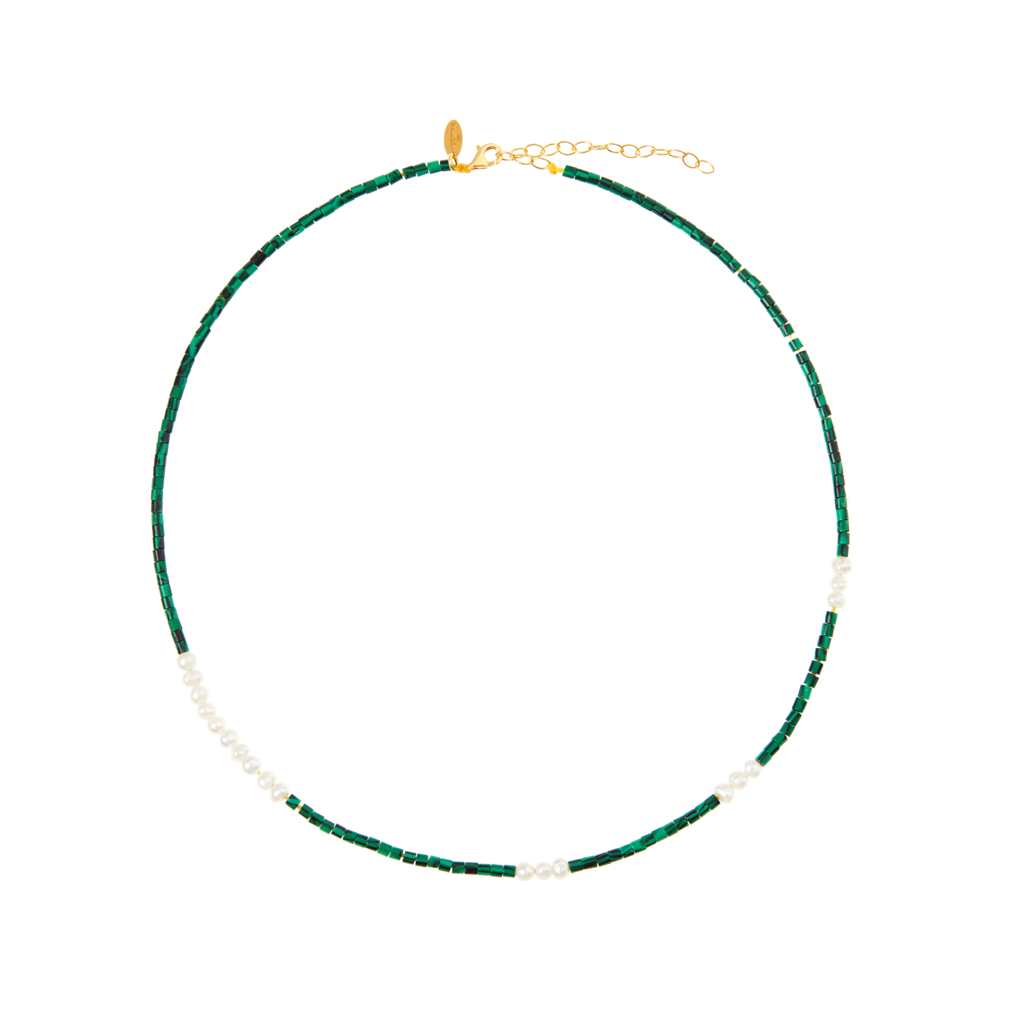 Это колье притягивает взгляды! Сочетание нежного жемчуга и малахита, камня трансформации и исцеления, поможет вам в создании идеального образа!