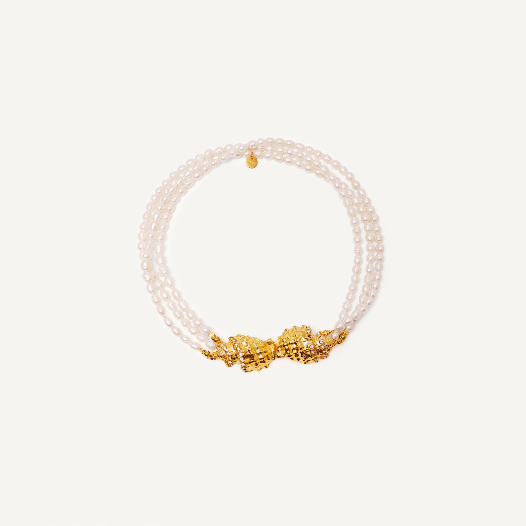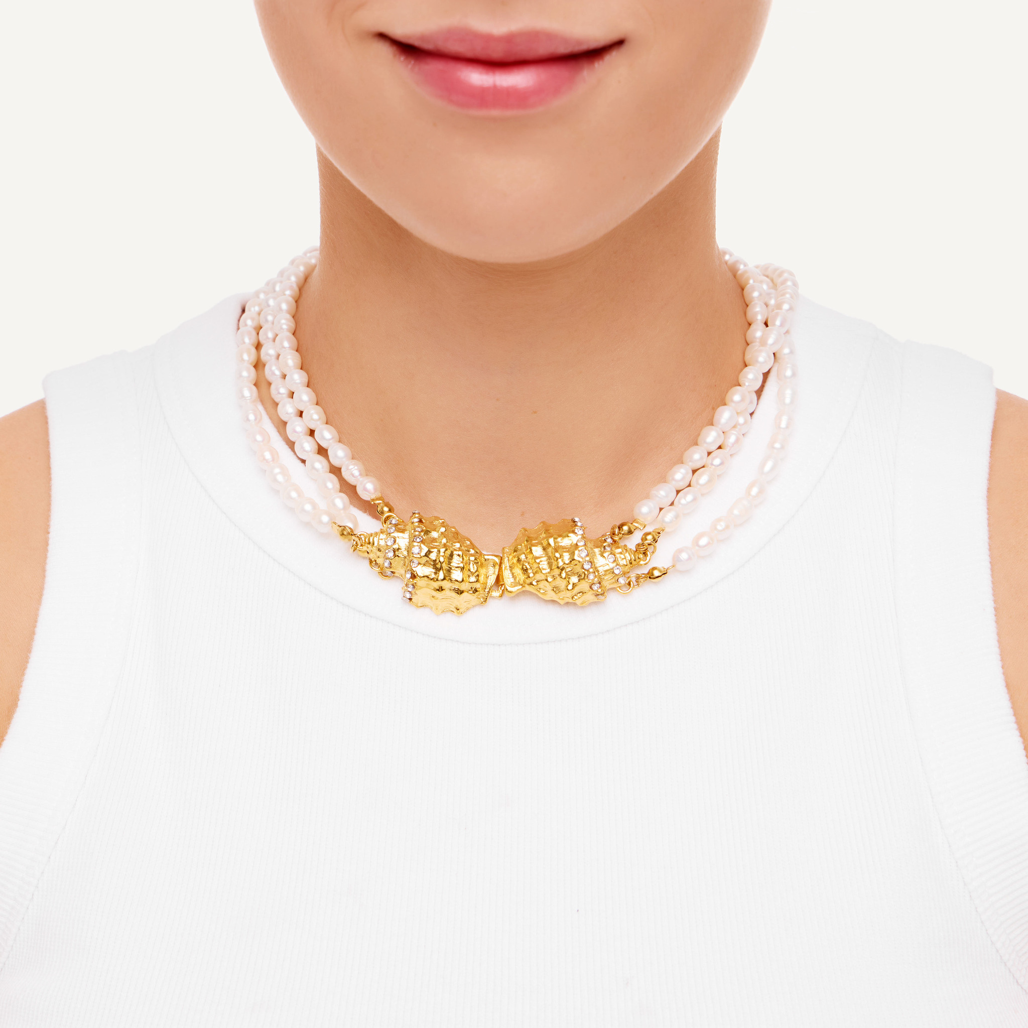 Массивное колье из латуни с искусственным жемчугом и латунными ракушками. Создано вручную в Греции мастерами бренда. Кусочек средиземноморского лета, который всегда будет с тобой.