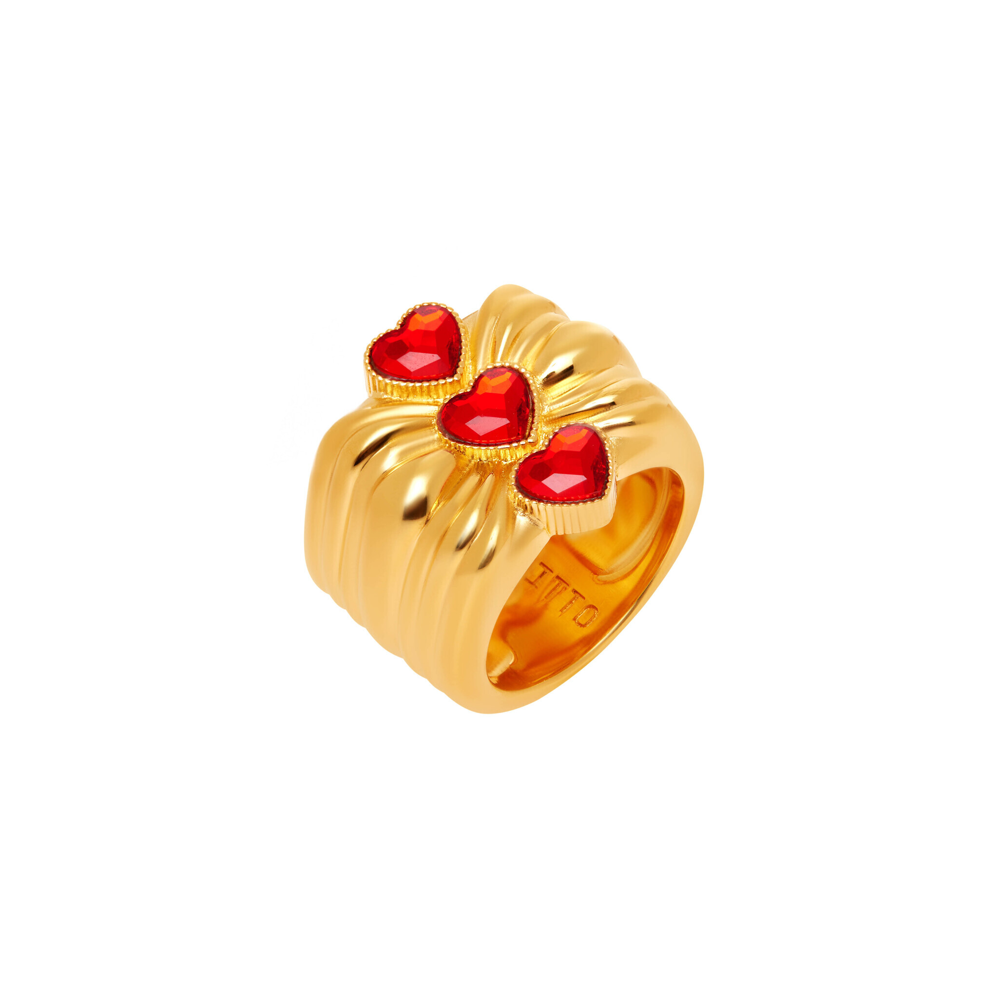 Это кольцо от бренда "Acchitto" имеет уникальный дизайн в форме бабочки, которую украшают сверху три кристалла в форме сердца. Снизу у колечка располагается один маленький кристалл, напоминающий логотип бренда - скрытая деталь, подчеркивающая изысканность творений "Acchitto".