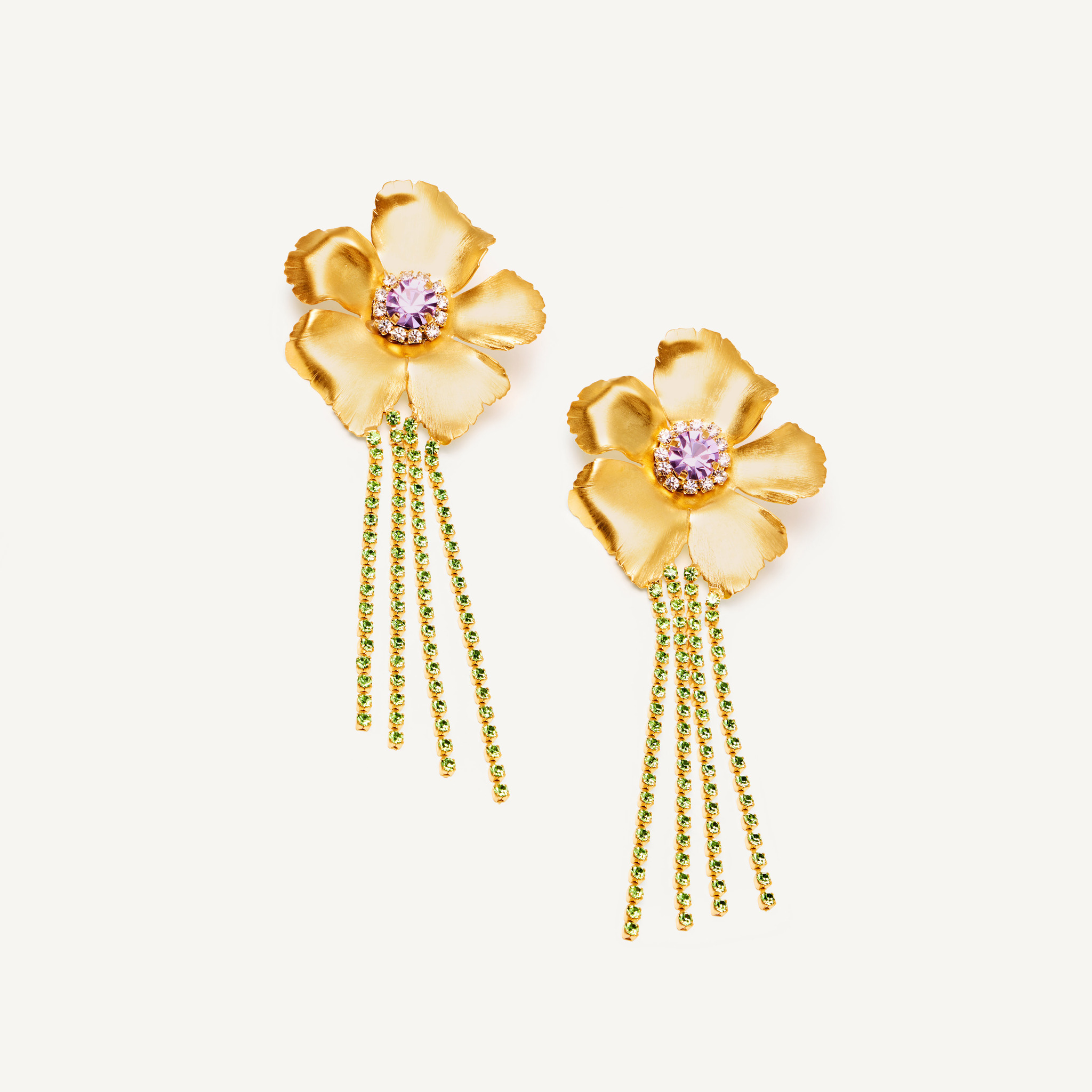 Акцентные серьги-цветы из латуни с цветными кристаллами молниеносно переносят нас в тёплый вечер у берегов Греции. Созданы вручную мастерами бренда Mayol.